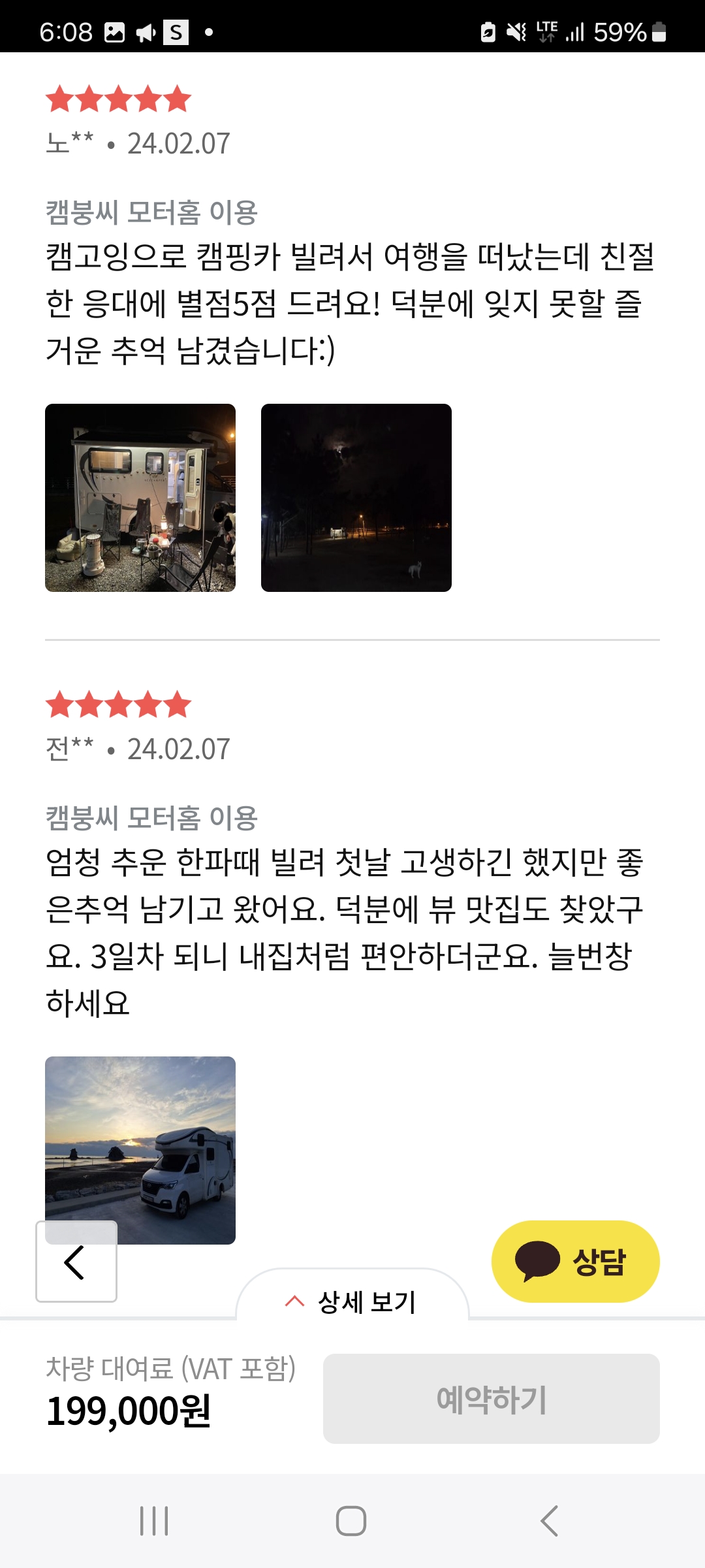 이전 사용자들의 리뷰와 평점을 통해 캠핑카의 상태와 렌트 서비스의 질을 미리 파악할 수 있습니다. 실제 이용자의 경험을 바탕으로 더 나은 선택을 할 수 있습니다. 각 캠핑카에 대한 솔직한 평가를 통해 안심하고 예약할 수 있습니다.